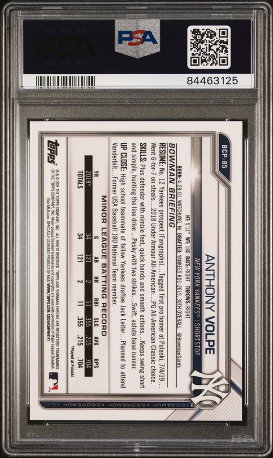 2021 Bowman Chrome Prospects #BCP85 Anthony Volpe 38/99 Green Shimmer Refractor PSA 10 GEM MT