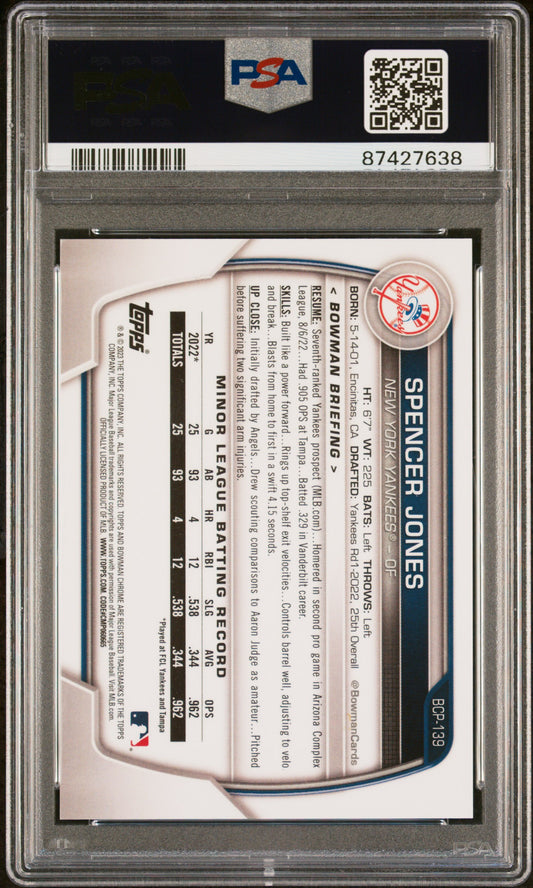 2023 Bowman Chrome Prospects #BCP139 Spencer Jones Chrome Blue Refractor PSA 9 MINT 113/150